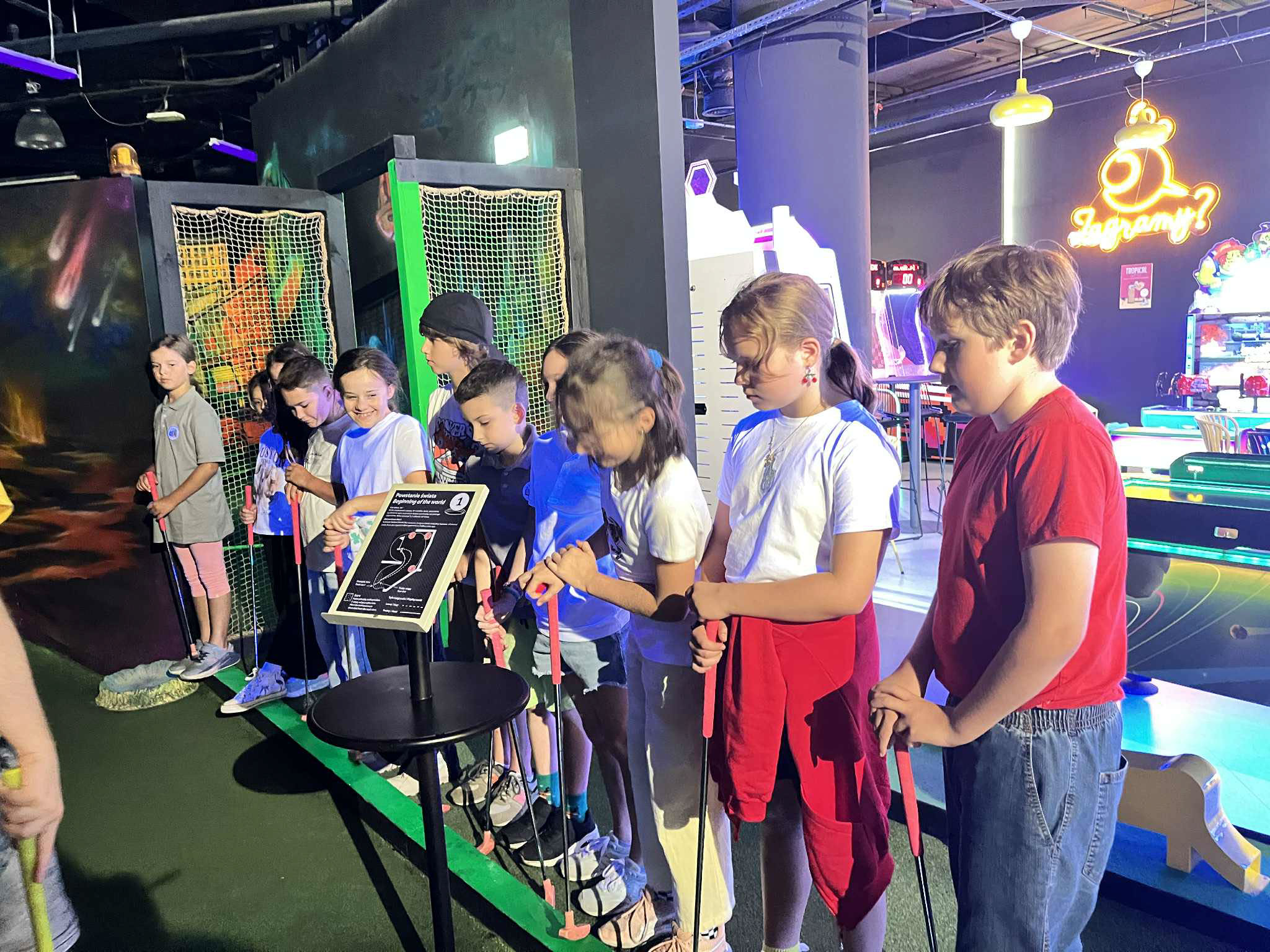 W tym tygodniu klasa 4B wybrała się na niezwykłą wycieczkę, która połączyła naukę z aktywnym wypoczynkiem! Pierwszym punktem programu był mini golf, ale nie taki zwykły! ⛳️ Każdy dołek przenosił uczniów w inny okres historyczny! Od starożytnego Egiptu, przez średniowiecze, aż po czasy nowożytne – to była niesamowita lekcja historii! Niezwykły sposób na poznanie ważnych wydarzeń, które kształtowały naszą rzeczywistość! Kolejnego dnia, pełni energii klasa 4B przeniosła się na trampoliny, gdzie skakali, śmiali się i spędzili cza wyładowując emocje po intensywnej podróży w czasie. 🏰💥 Zaskakujące, jak połączenie aktywności fizycznej z nauką może dostarczyć tylu emocji!